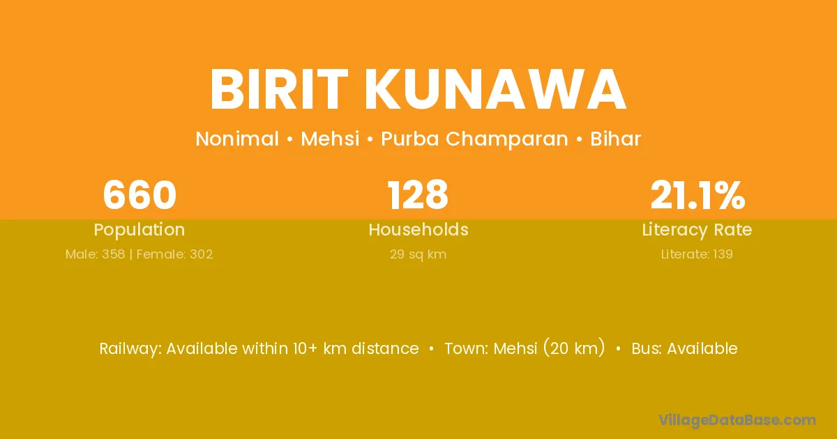 Birit Kunawa village has a total population of 660 people, of which 358 are males and 302 are females.
