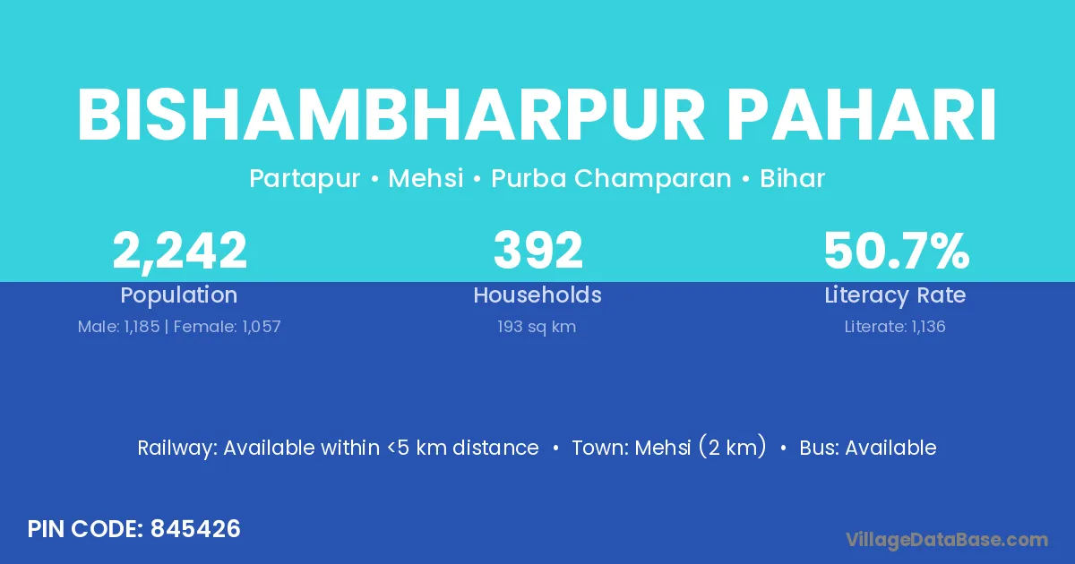Mehsi (2 km) is the nearest town to Bishambharpur Pahari village for major economic activities and is located approximately 2 km away.