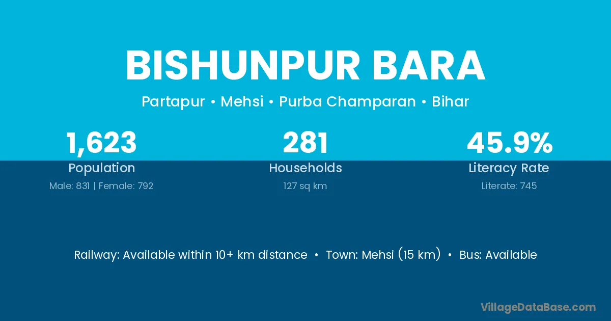 Mehsi (15 km) is the nearest town to Bishunpur Bara village for major economic activities and is located approximately 15 km away.