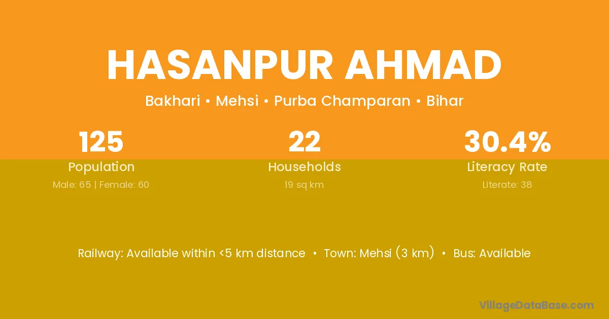 Mehsi (3 km) is the nearest town to Hasanpur Ahmad village for major economic activities and is located approximately 3 km away.