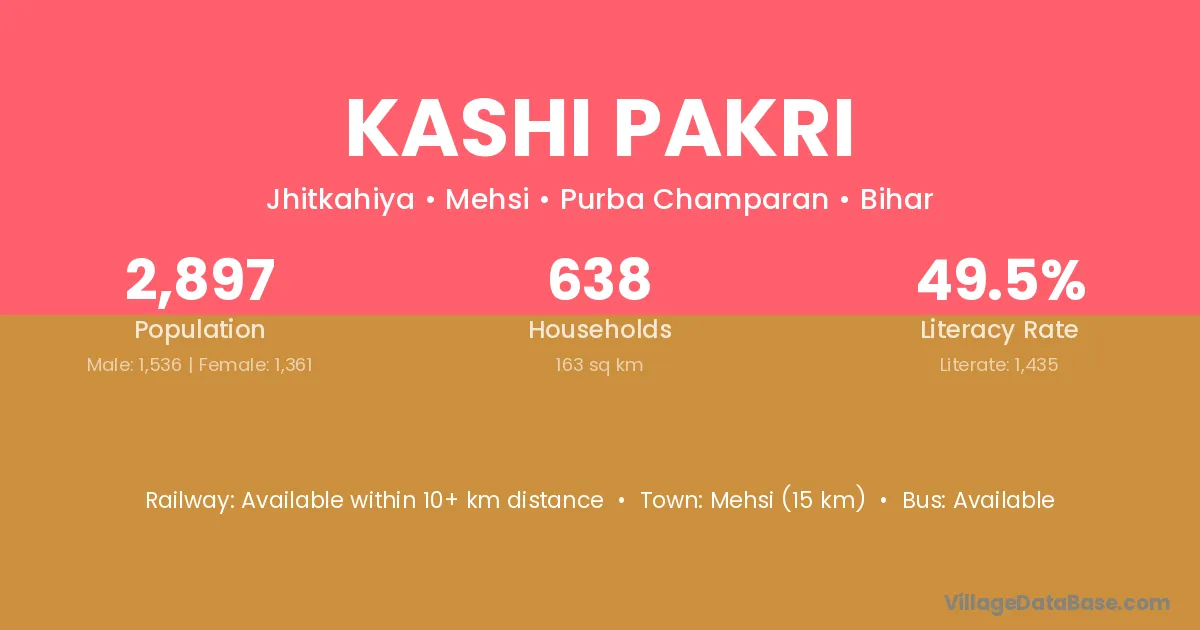 Mehsi (15 km) is the nearest town to Kashi Pakri village for major economic activities and is located approximately 15 km away.