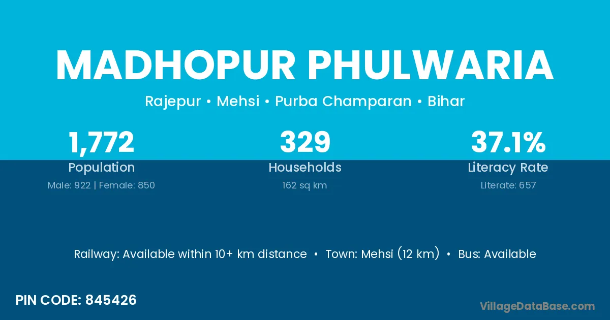 Mehsi (12 km) is the nearest town to Madhopur Phulwaria village for major economic activities and is located approximately 12 km away.
