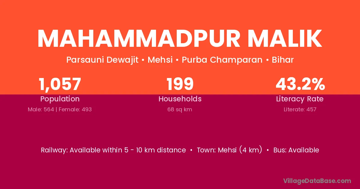 Mehsi (4 km) is the nearest town to Mahammadpur Malik village for major economic activities and is located approximately 4 km away.