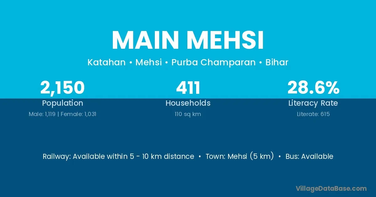 Mehsi (5 km) is the nearest town to Main Mehsi village for major economic activities and is located approximately 5 km away.