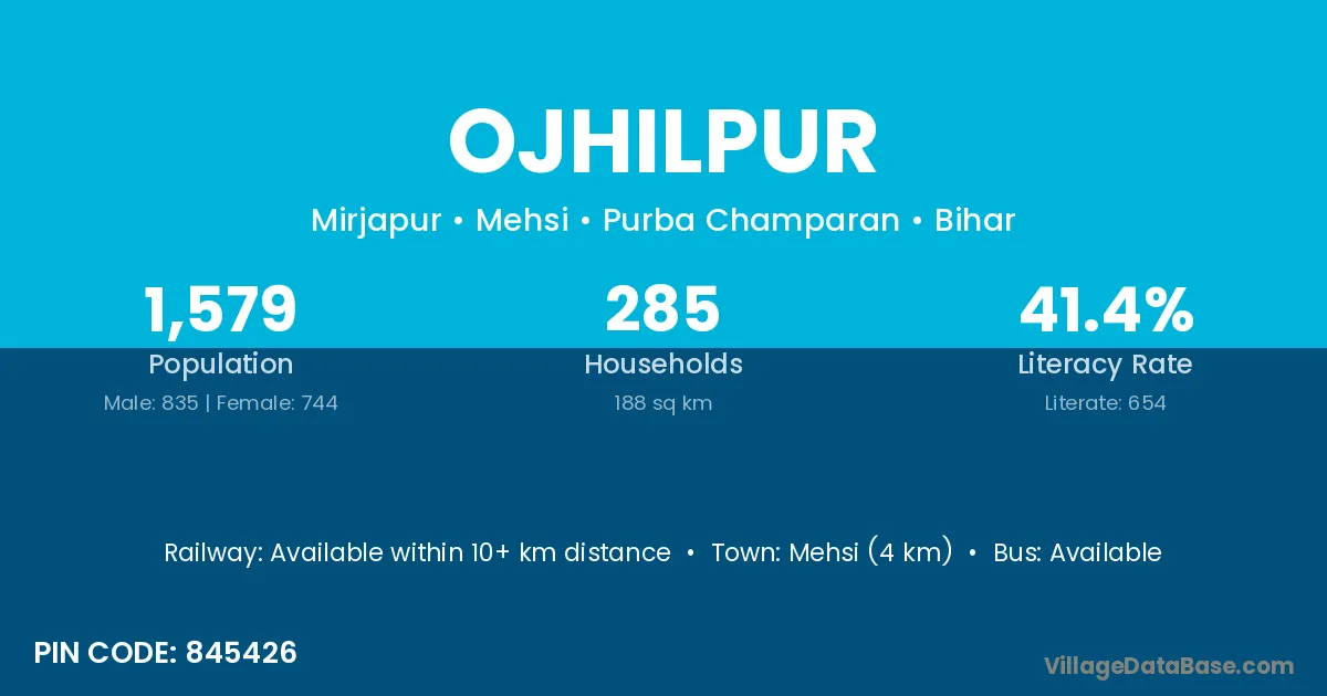 Mehsi (4 km) is the nearest town to Ojhilpur village for major economic activities and is located approximately 4 km away.