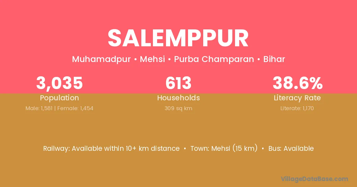 Mehsi (15 km) is the nearest town to Salemppur village for major economic activities and is located approximately 15 km away.