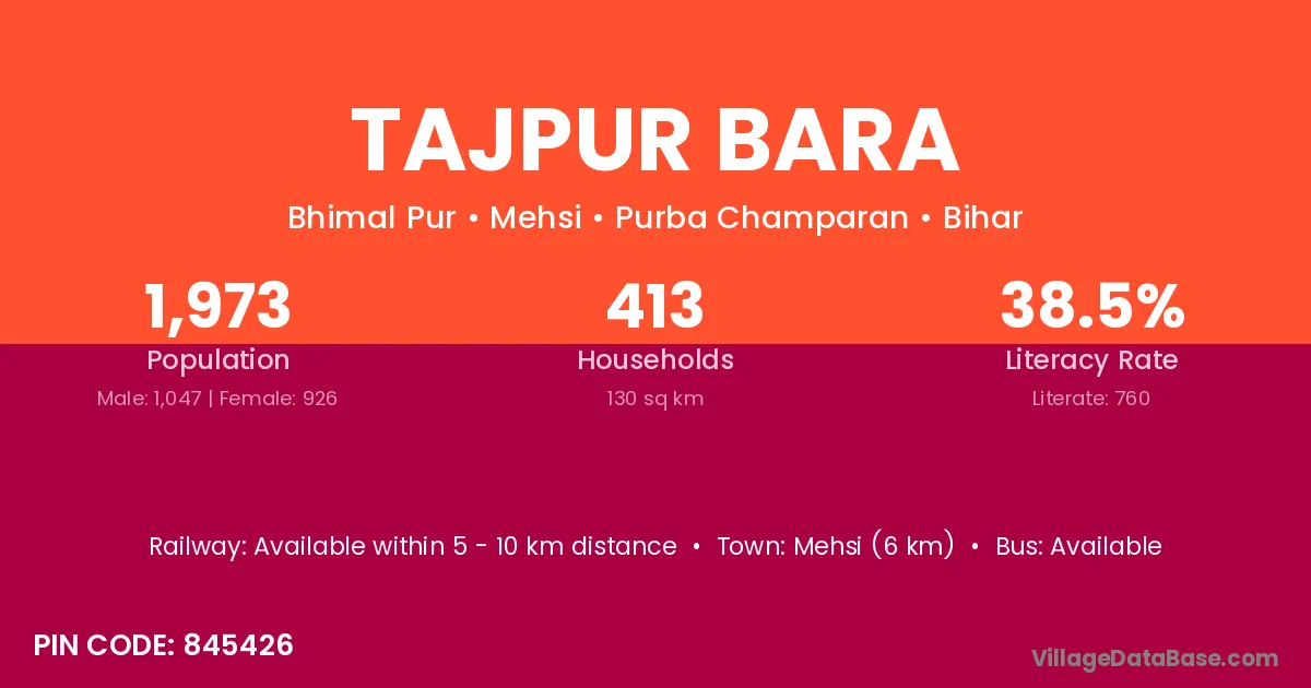 Mehsi (6 km) is the nearest town to Tajpur Bara village for major economic activities and is located approximately 6 km away.