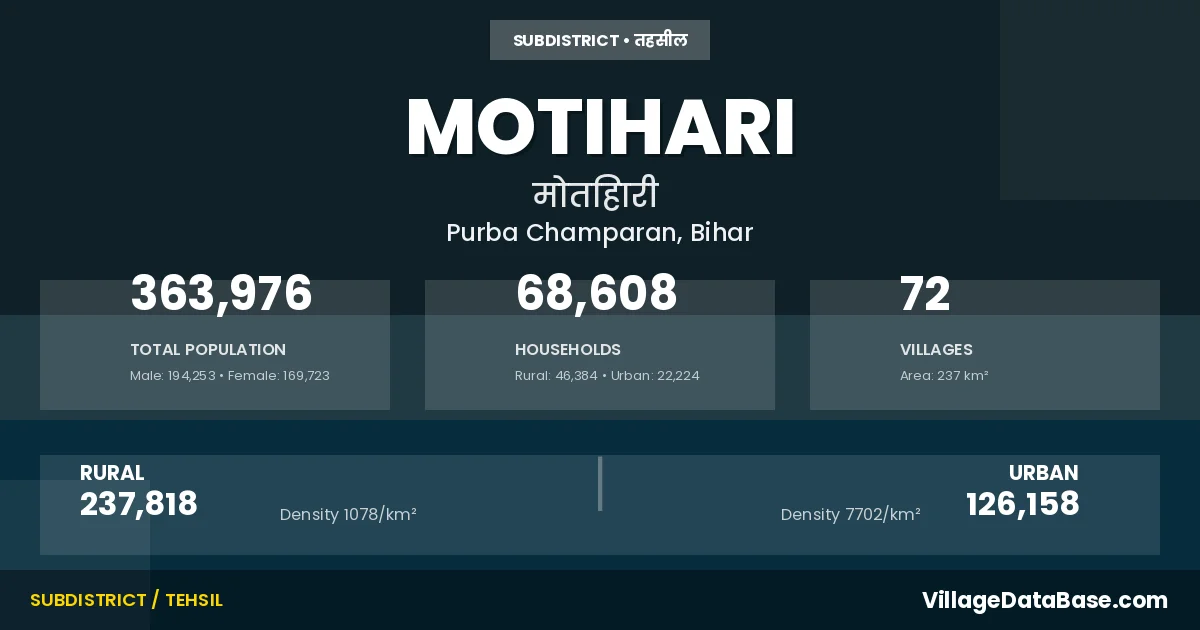 According to the 2011 census The total area of Motihari Subdivision is 237 km², with a population of 363976 people. The population density is 1,536 inhabitants per square kilometre, and there are approximately 68608 houses in the sub district.