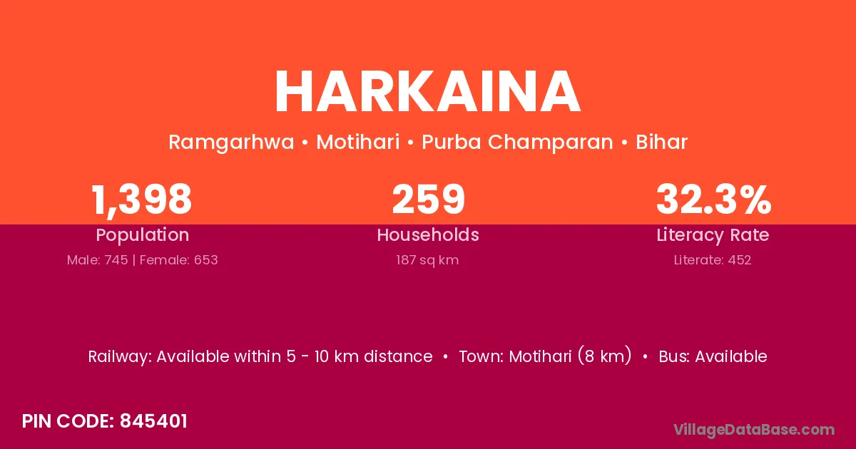 Motihari (8 km) is the nearest town to Harkaina village for major economic activities and is located approximately 8 km away.
