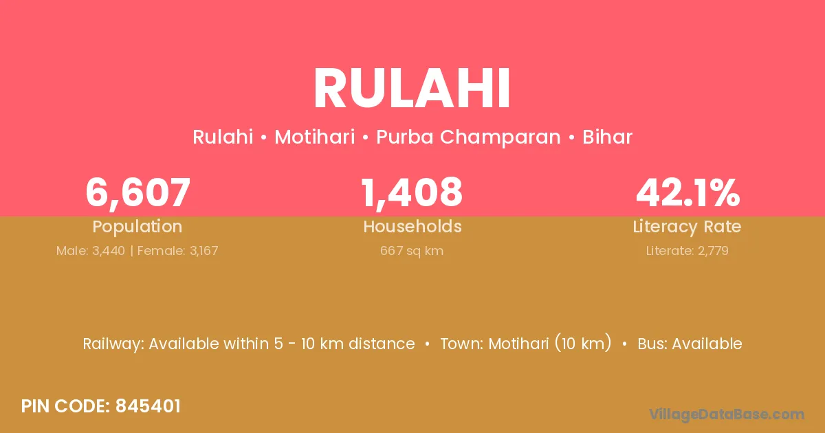 Motihari (10 km) is the nearest town to Rulahi village for major economic activities and is located approximately 10 km away.