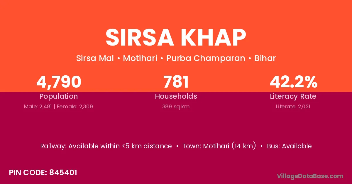 Motihari (14 km) is the nearest town to Sirsa Khap village for major economic activities and is located approximately 14 km away.