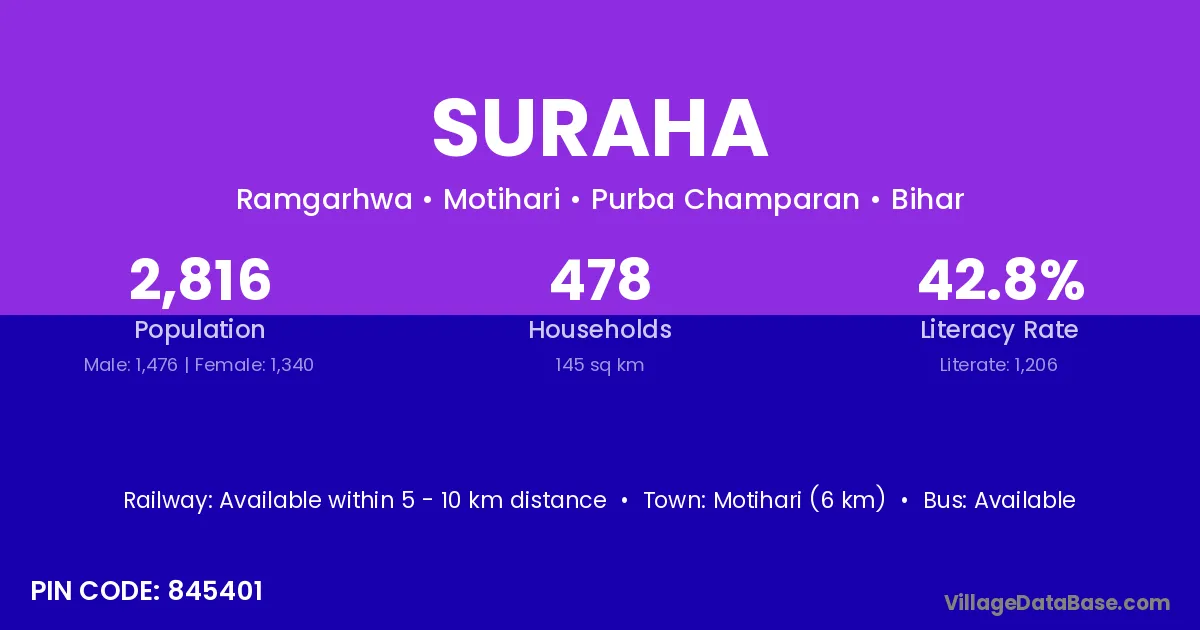 Motihari (6 km) is the nearest town to Suraha village for major economic activities and is located approximately 6 km away.