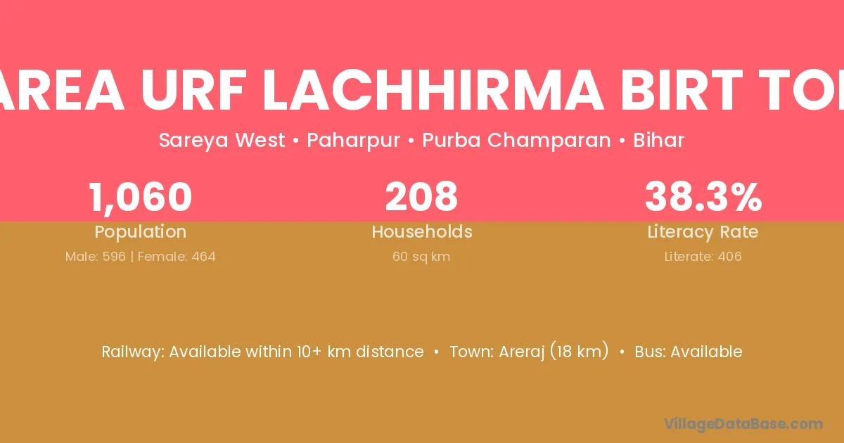 Sarea Urf Lachhirma Birt Tola village has a total population of 1,060 people, of which 596 are males and 464 are females.