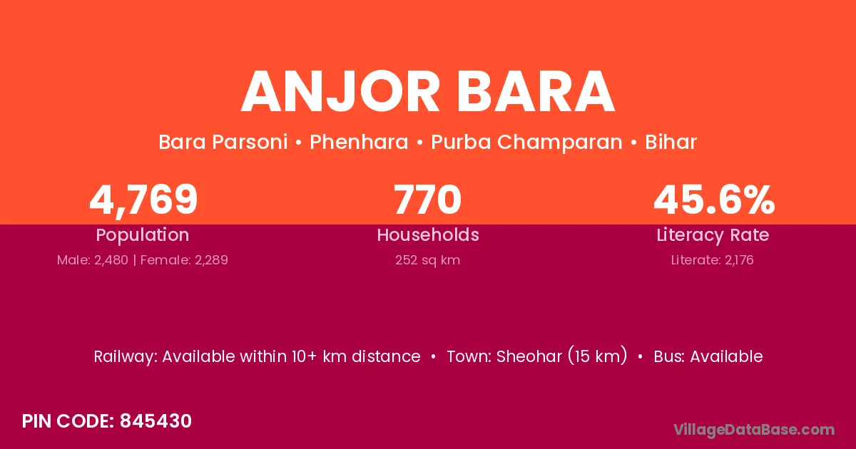Sheohar (15 km) is the nearest town to Anjor Bara village for major economic activities and is located approximately 15 km away.