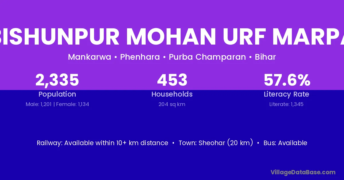 Sheohar (20 km) is the nearest town to Bishunpur Mohan Urf Marpa village for major economic activities and is located approximately 20 km away.