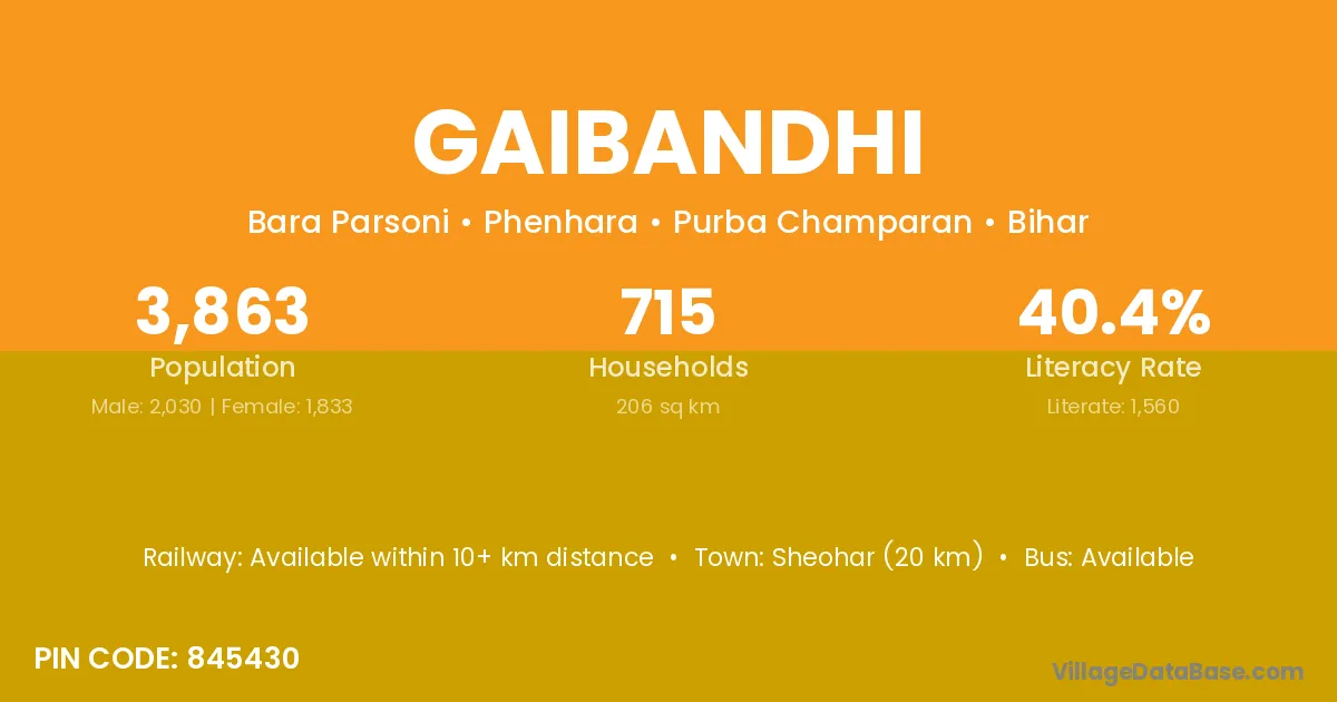 Sheohar (20 km) is the nearest town to Gaibandhi village for major economic activities and is located approximately 20 km away.