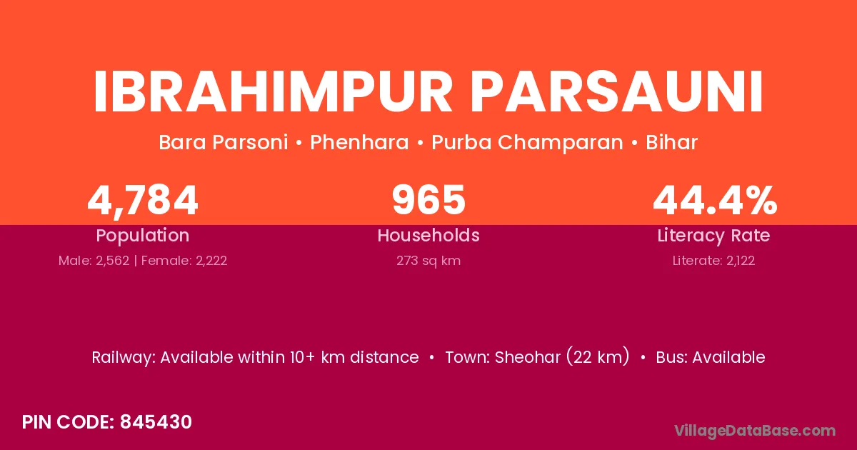 Sheohar (22 km) is the nearest town to Ibrahimpur Parsauni village for major economic activities and is located approximately 22 km away.