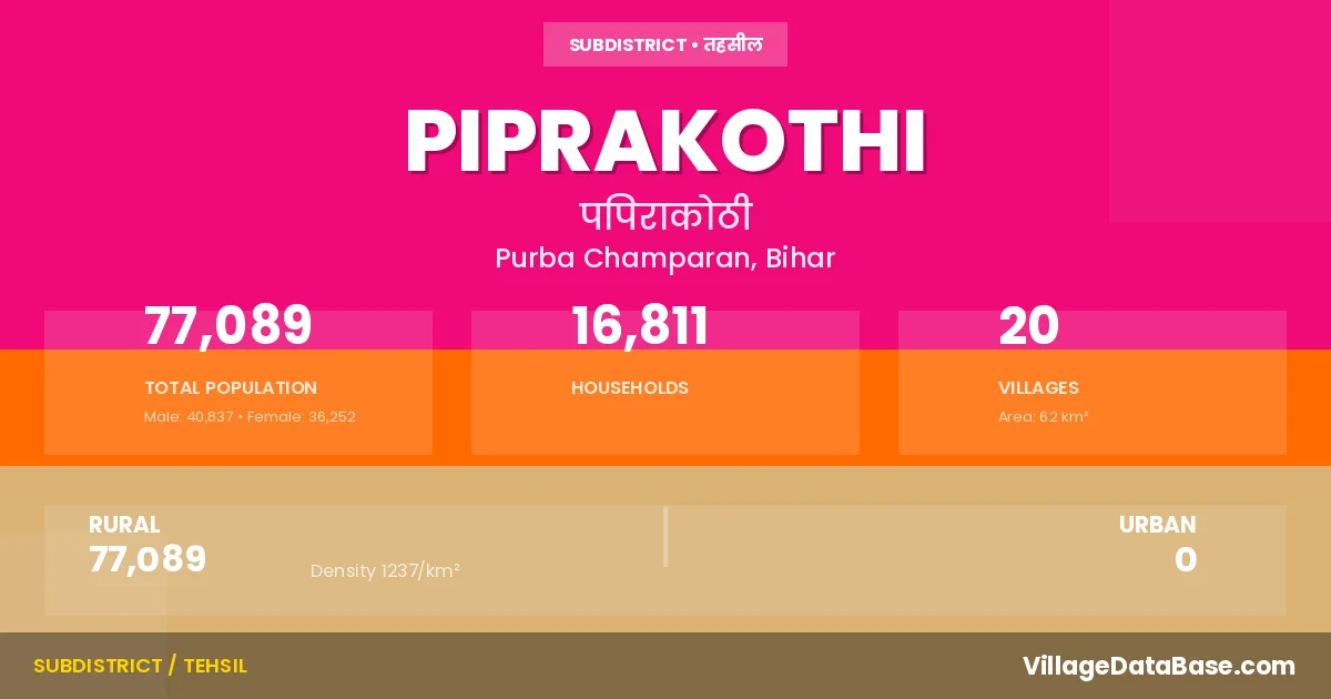 According to the 2011 census The total area of Piprakothi Subdivision is 62 km², with a population of 77089 people. The population density is 1,237 inhabitants per square kilometre, and there are approximately 16811 houses in the sub district.