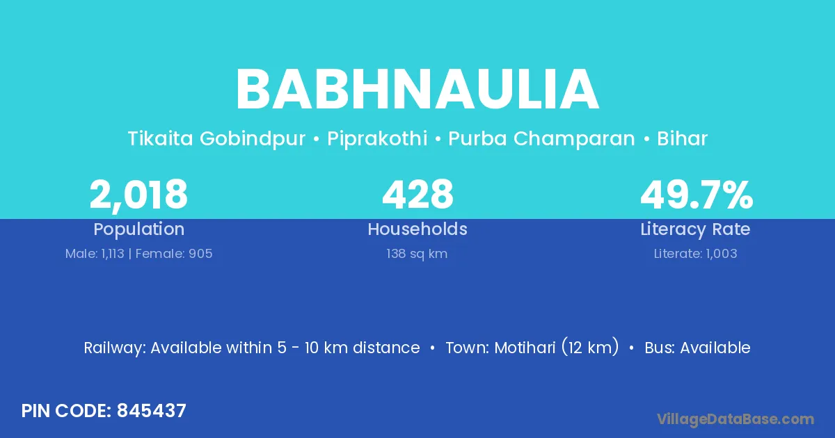 Motihari (12 km) is the nearest town to Babhnaulia village for major economic activities and is located approximately 12 km away.