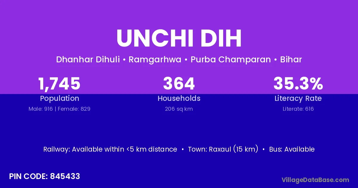 Raxaul (15 km) is the nearest town to Unchi Dih village for major economic activities and is located approximately 15 km away.