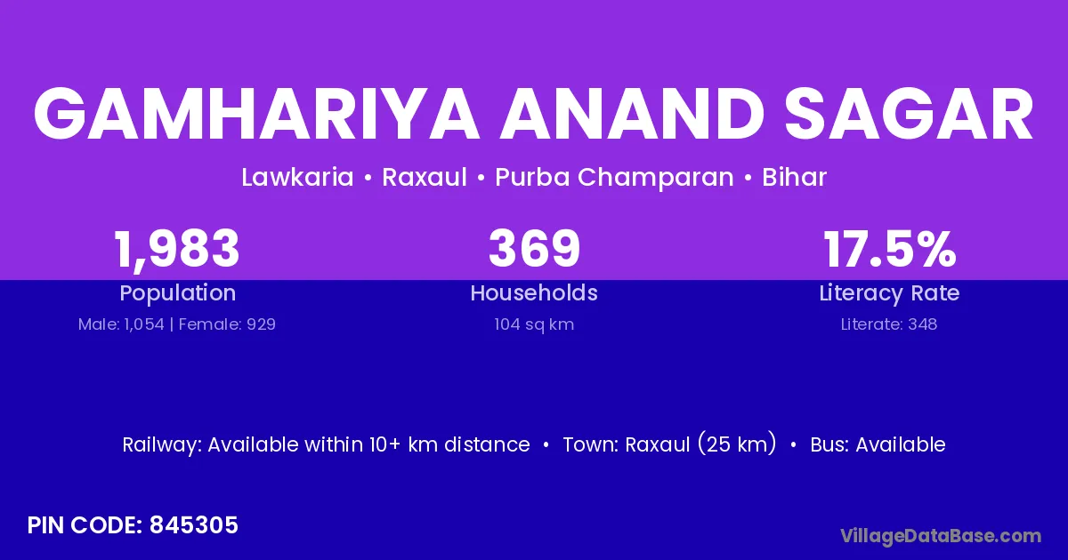 Raxaul (25 km) is the nearest town to Gamhariya Anand Sagar village for major economic activities and is located approximately 25 km away.