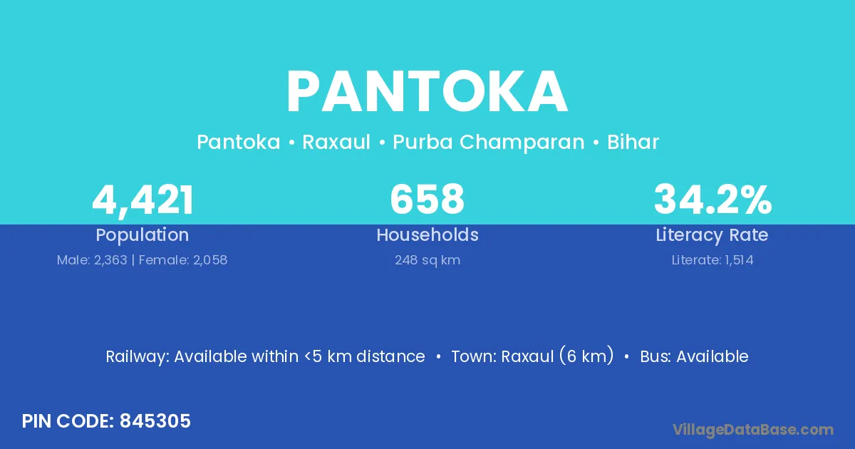 Raxaul (6 km) is the nearest town to Pantoka village for major economic activities and is located approximately 6 km away.