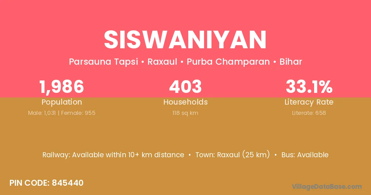 Raxaul (25 km) is the nearest town to Siswaniyan village for major economic activities and is located approximately 25 km away.