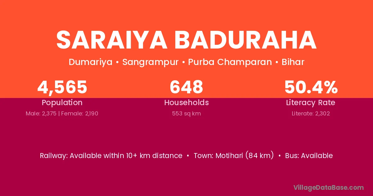 Motihari (84 km) is the nearest town to Saraiya Baduraha village for major economic activities and is located approximately 84 km away.