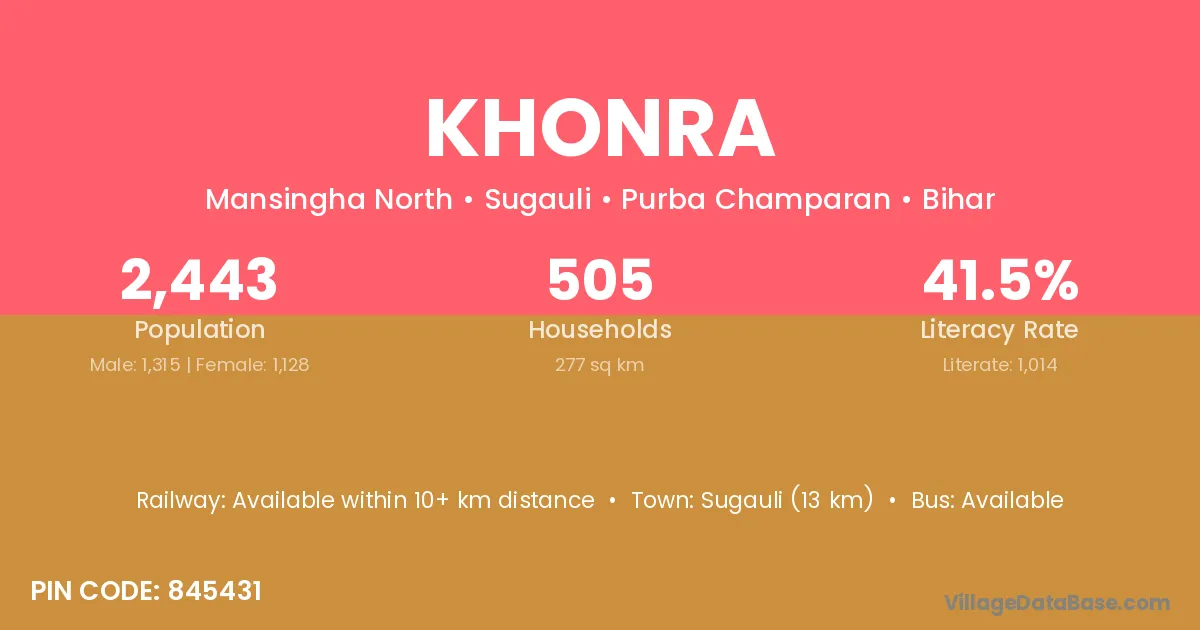Sugauli (13 km) is the nearest town to Khonra village for major economic activities and is located approximately 13 km away.