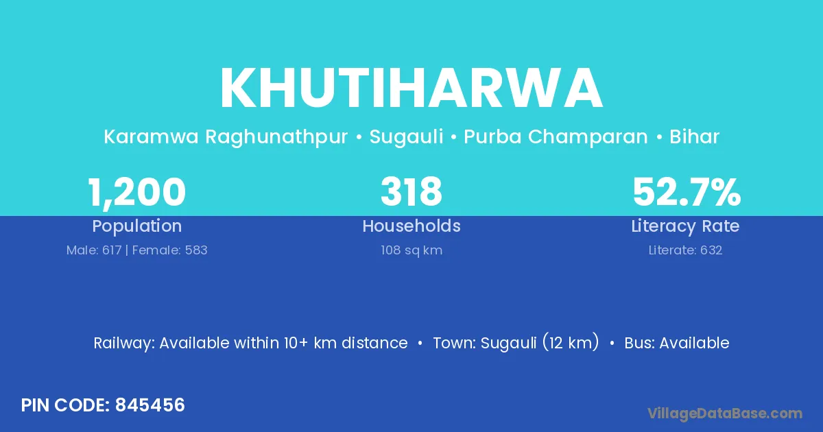 Sugauli (12 km) is the nearest town to Khutiharwa village for major economic activities and is located approximately 12 km away.