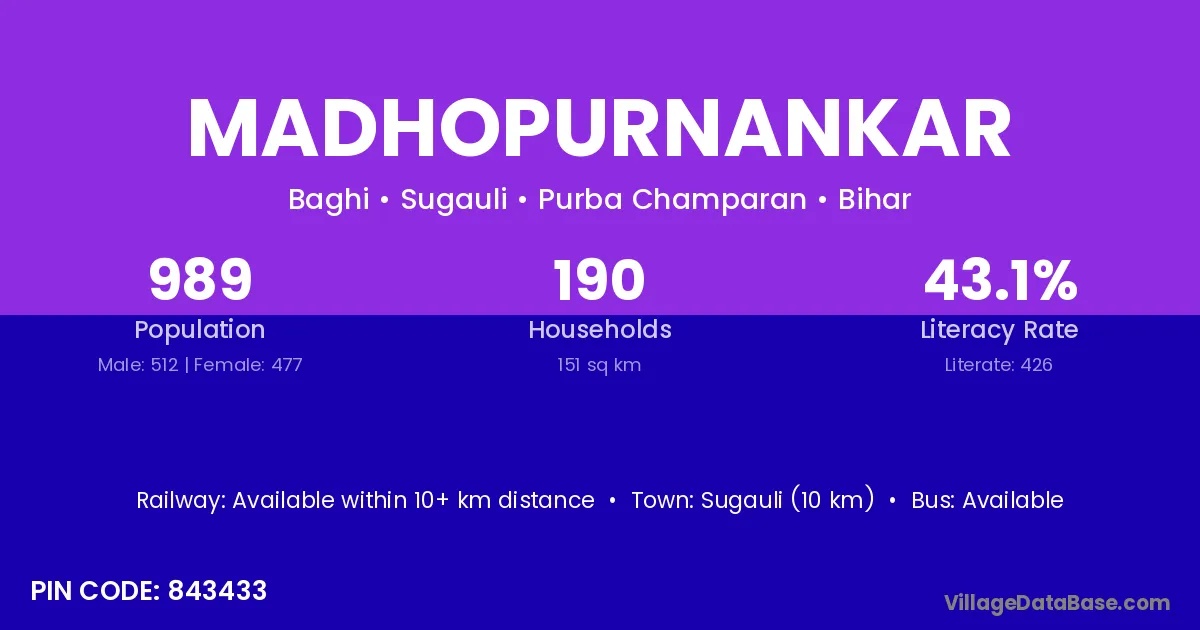 Sugauli (10 km) is the nearest town to Madhopurnankar village for major economic activities and is located approximately 10 km away.