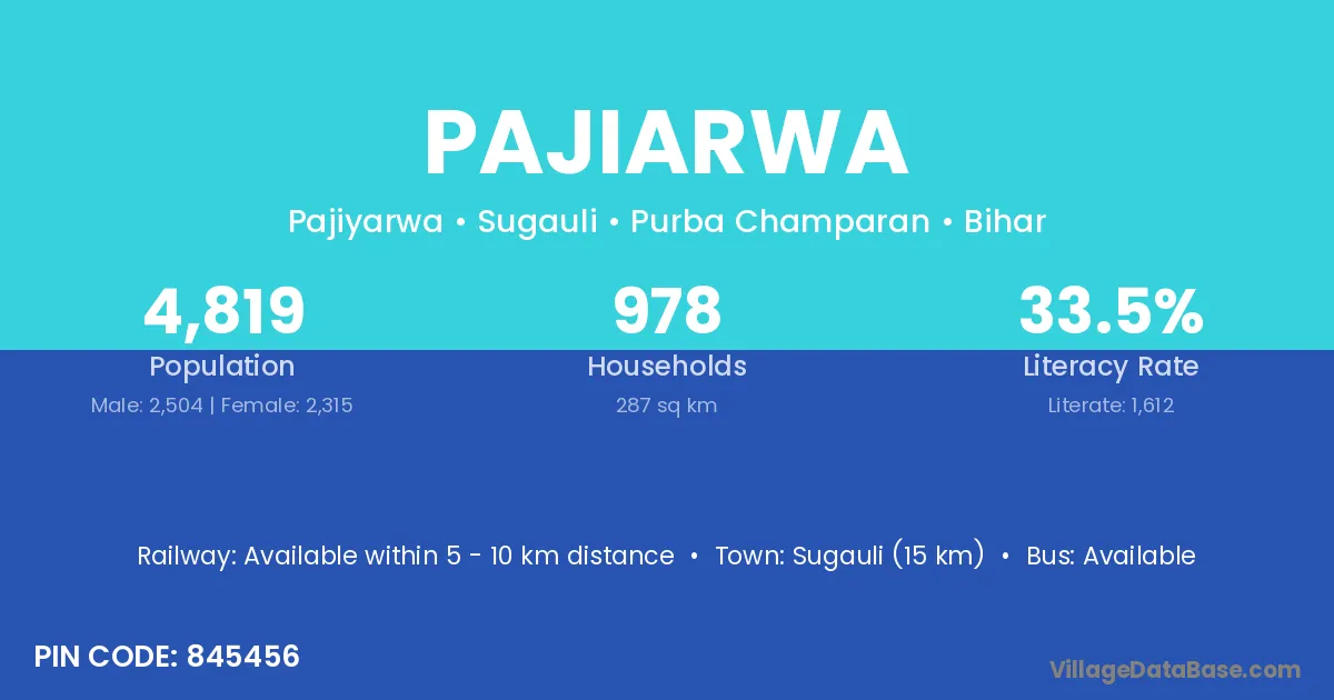 Sugauli (15 km) is the nearest town to Pajiarwa village for major economic activities and is located approximately 15 km away.