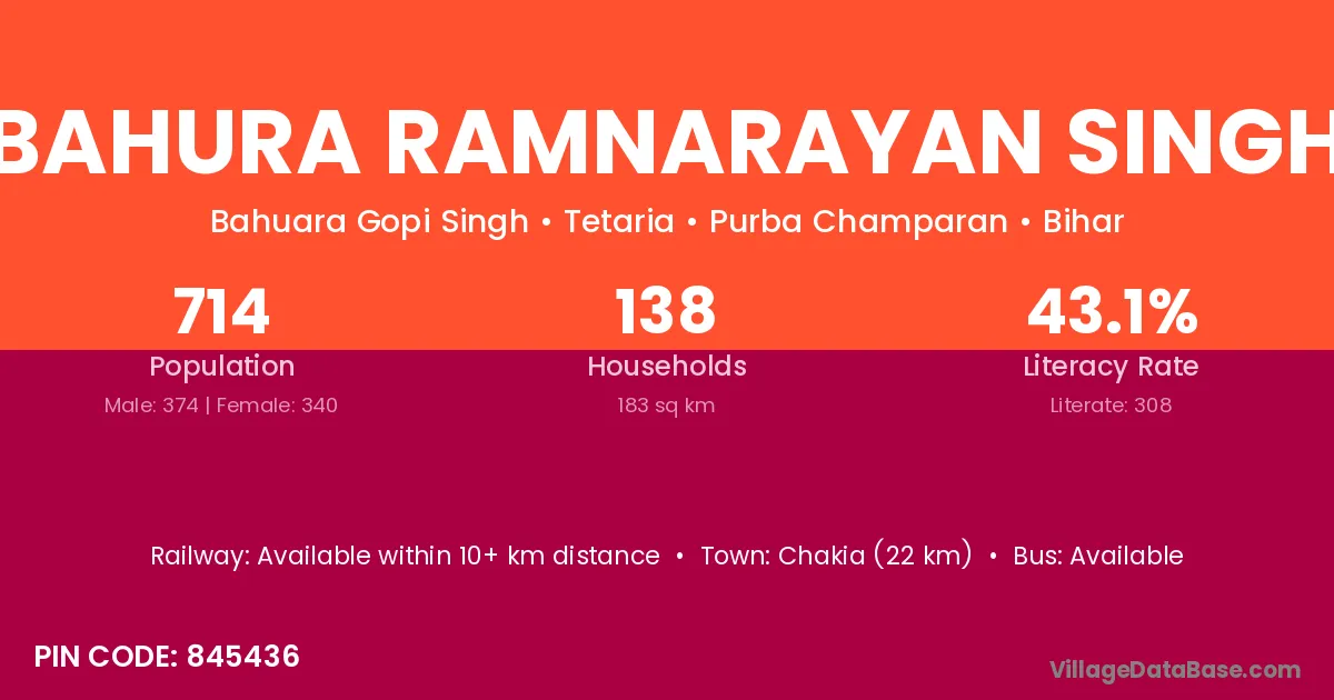 Chakia (22 km) is the nearest town to Bahura Ramnarayan Singh village for major economic activities and is located approximately 22 km away.