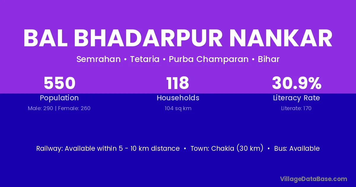 Chakia (30 km) is the nearest town to Bal Bhadarpur Nankar village for major economic activities and is located approximately 30 km away.