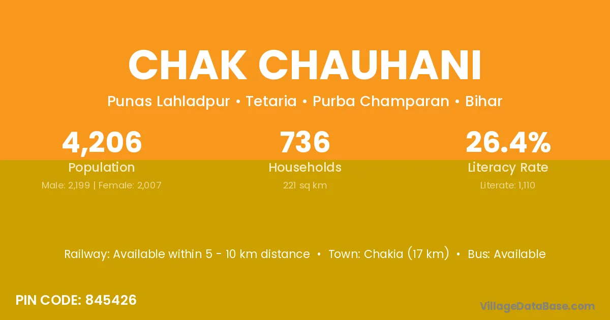 Chakia (17 km) is the nearest town to Chak Chauhani village for major economic activities and is located approximately 17 km away.