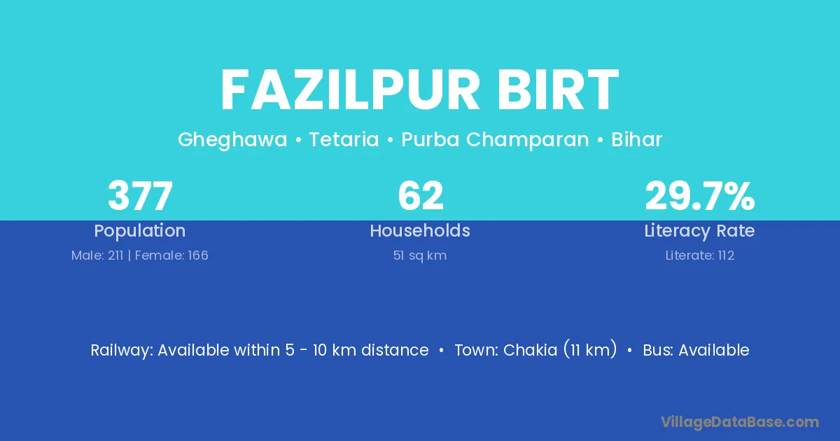 Chakia (11 km) is the nearest town to Fazilpur Birt village for major economic activities and is located approximately 11 km away.