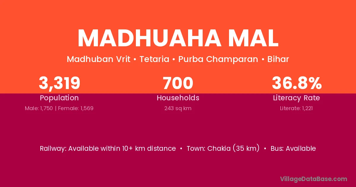 Chakia (35 km) is the nearest town to Madhuaha Mal village for major economic activities and is located approximately 35 km away.