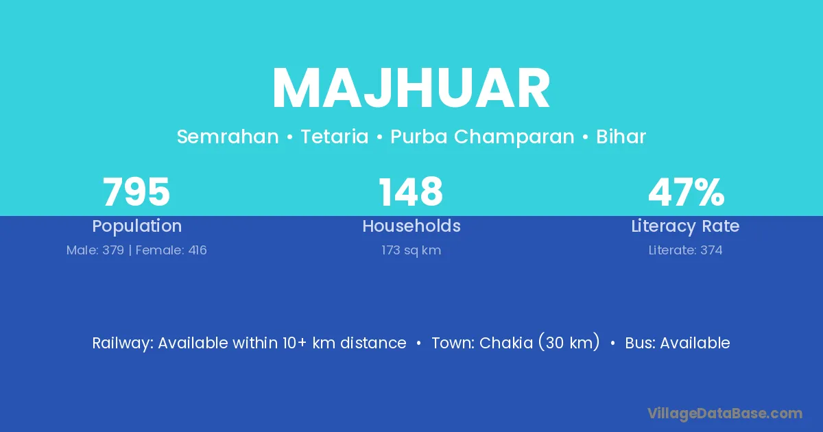 Chakia (30 km) is the nearest town to Majhuar village for major economic activities and is located approximately 30 km away.