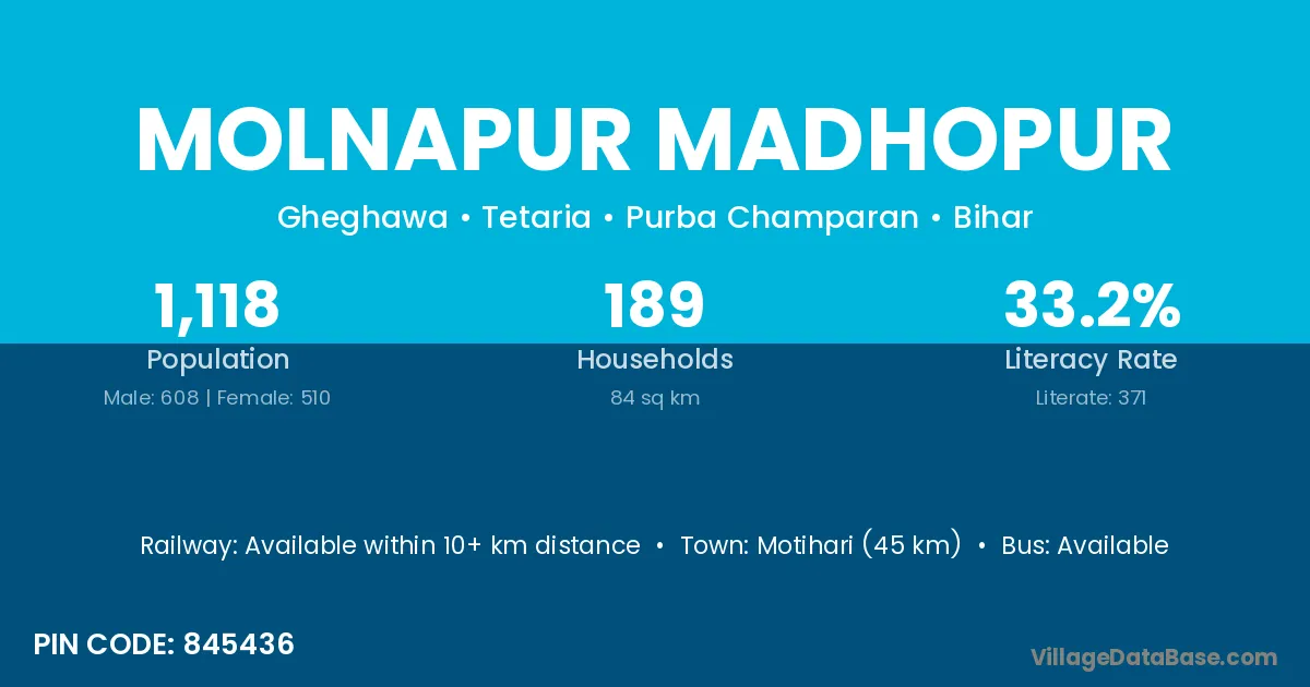 Motihari (45 km) is the nearest town to Molnapur Madhopur village for major economic activities and is located approximately 45 km away.