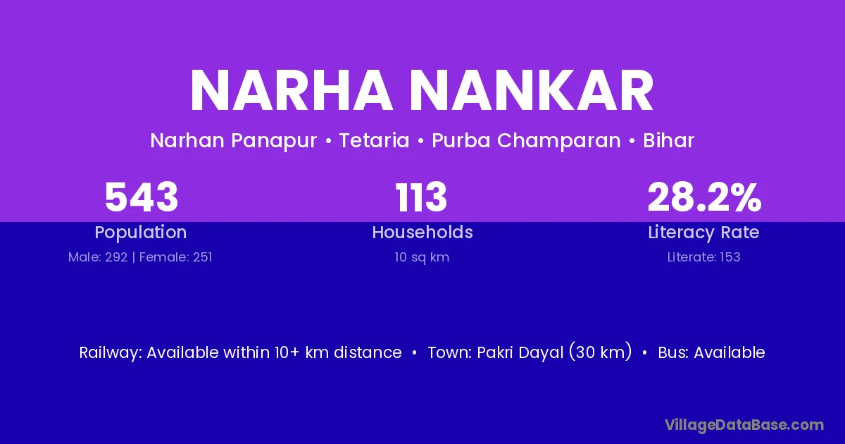 Pakri Dayal (30 km) is the nearest town to Narha Nankar village for major economic activities and is located approximately 30 km away.