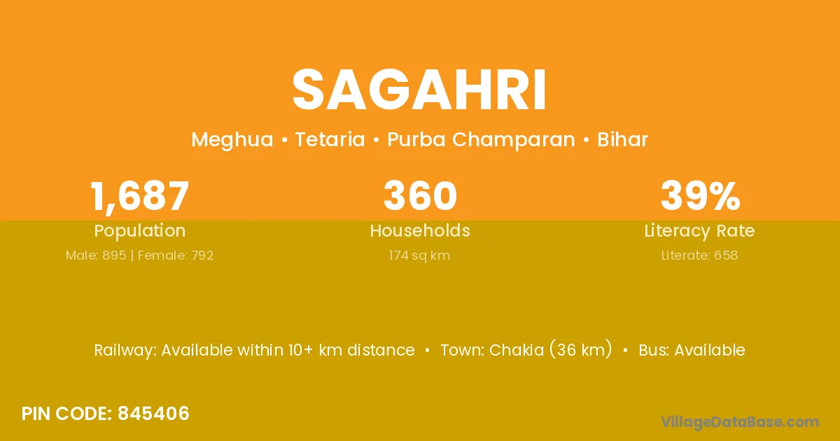 Chakia (36 km) is the nearest town to Sagahri village for major economic activities and is located approximately 36 km away.