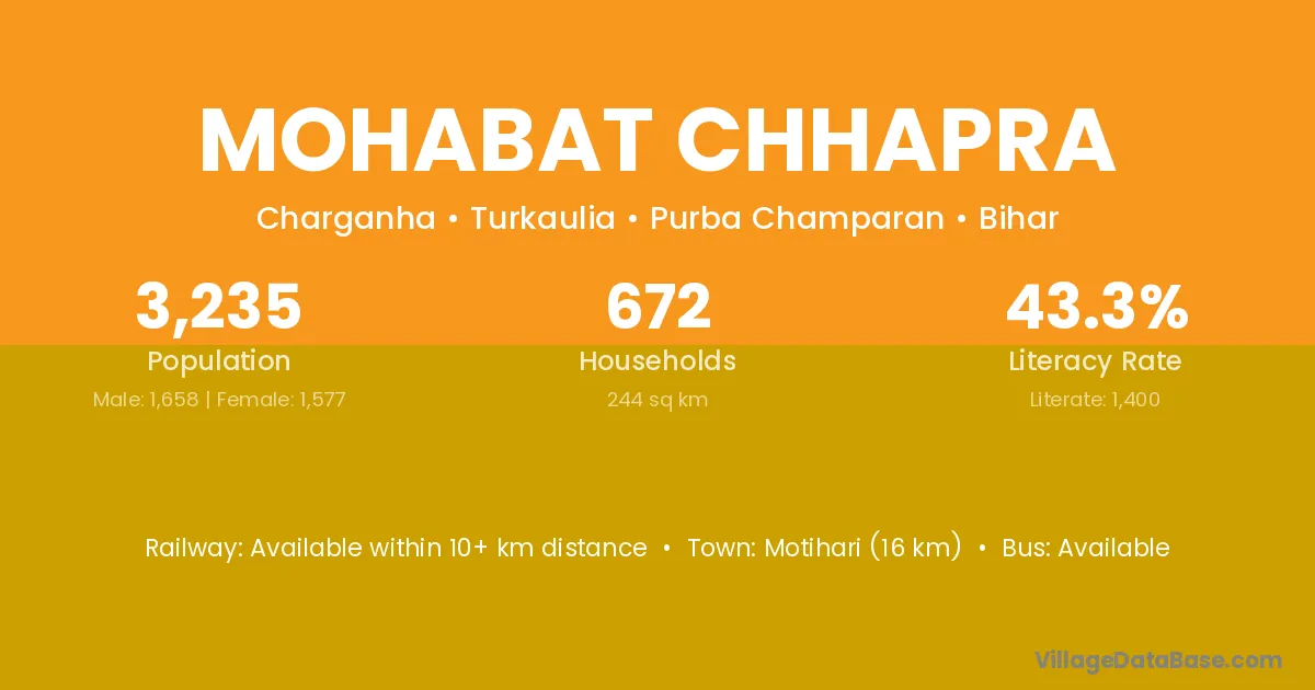 Mohabat Chhapra village has a total population of 3,235 people, of which 1,658 are males and 1,577 are females.