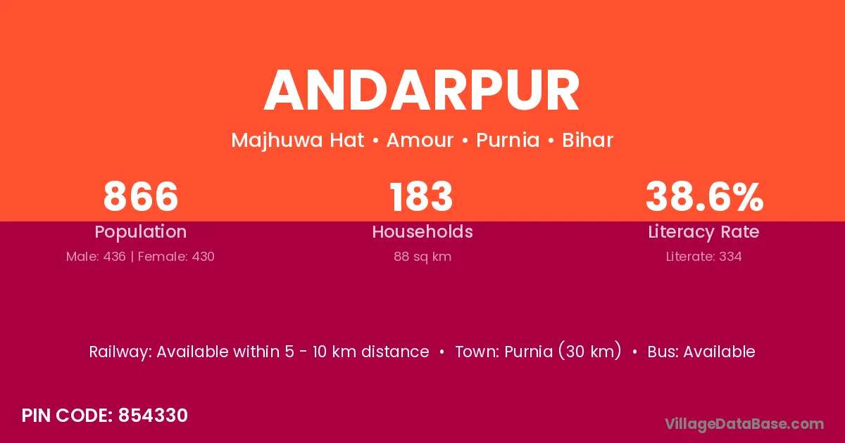 Purnia (30 km) is the nearest town to Andarpur village for major economic activities and is located approximately 30 km away.