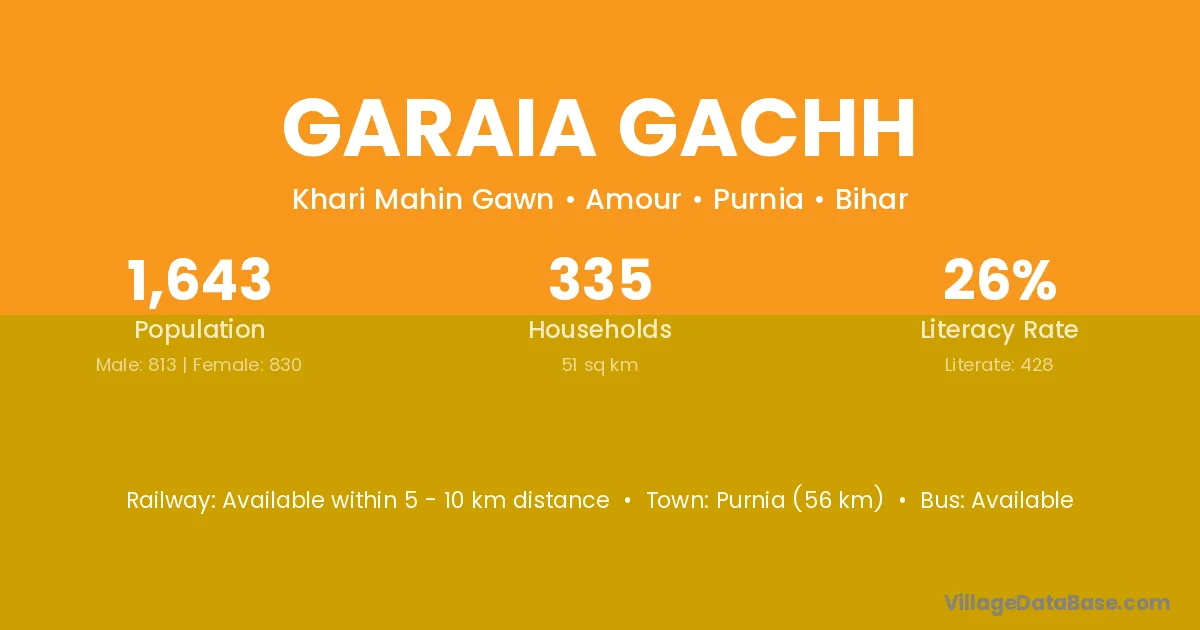 Purnia (56 km) is the nearest town to Garaia Gachh village for major economic activities and is located approximately 56 km away.