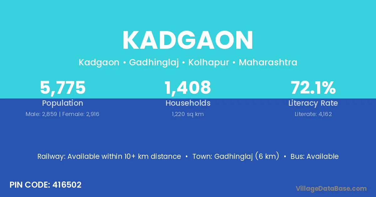 Kadgaon village has a total population of 513 people, of which 258 are males and 255 are females.