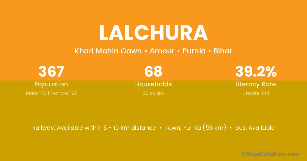 Purnia (56 km) is the nearest town to Lalchura village for major economic activities and is located approximately 56 km away.