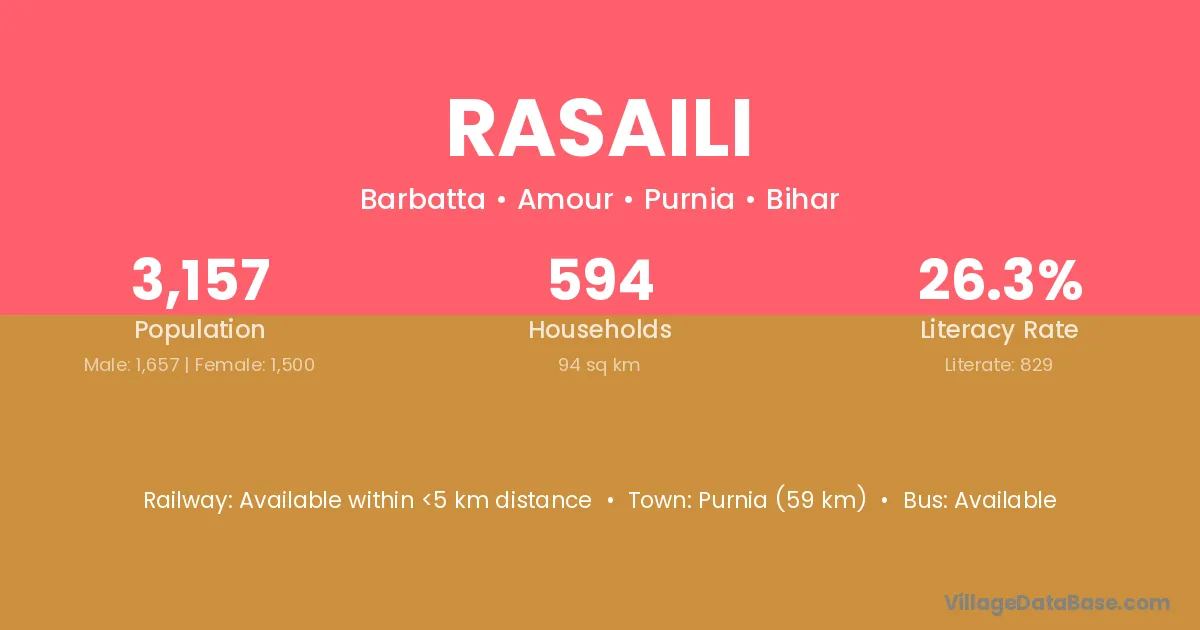 Purnia (59 km) is the nearest town to Rasaili village for major economic activities and is located approximately 59 km away.