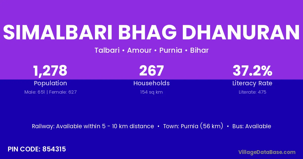 Purnia (56 km) is the nearest town to Simalbari Bhag Dhanuran village for major economic activities and is located approximately 56 km away.