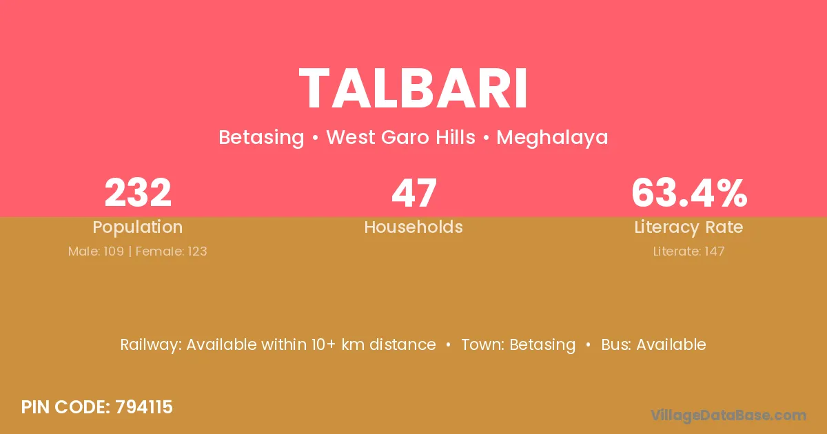 The literacy rate of Talbari village is 39.78%. Male literacy stands at 48.10% and female literacy at 30.60%.