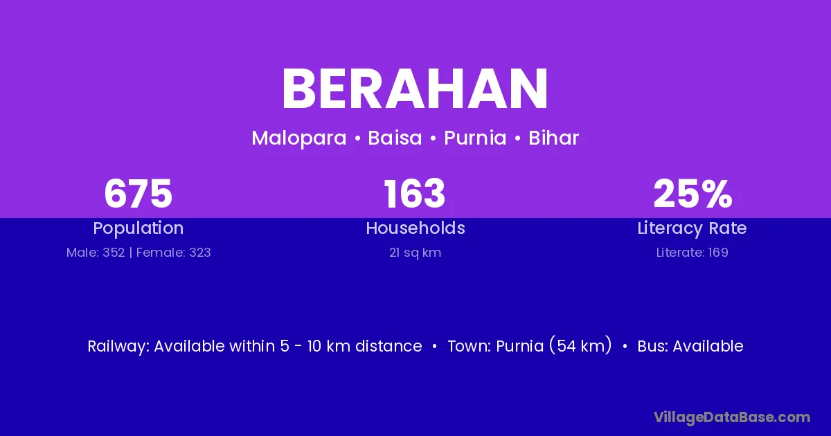 Purnia (54 km) is the nearest town to Berahan village for major economic activities and is located approximately 54 km away.